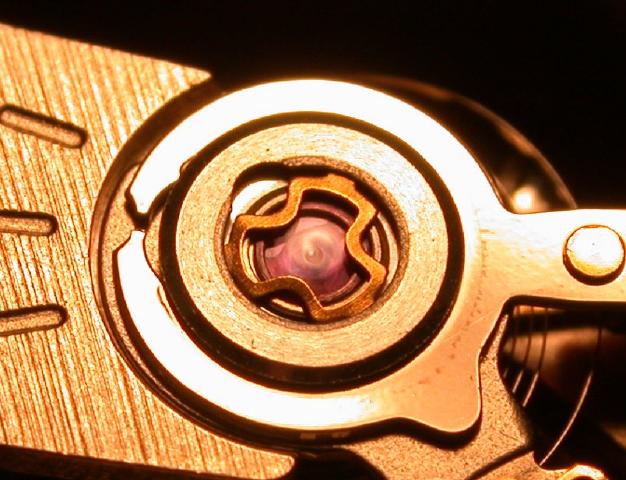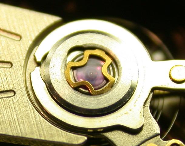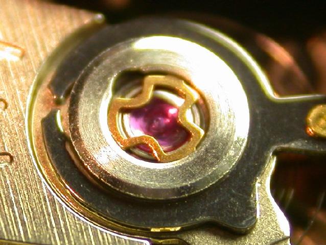 In the picture above you can see that the cap jewel was not properly cleaned prior to being oiled. The balance staff end has worn away a nice clear spot in what apears to be a milky filmy area surrounding it.