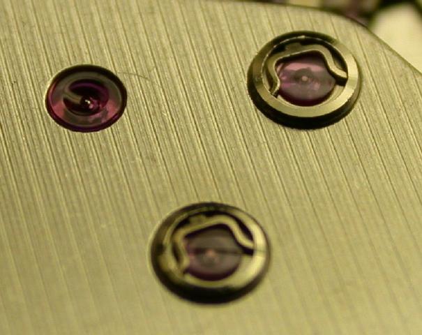 Note how the jewels are clear,save for there color. And that the oil drop is centered,and ONLY fills the oil well. THIS is what a properly oiled cap jewel assembly should look like. And,btw,those "diafix" springs are a REAL PITA.