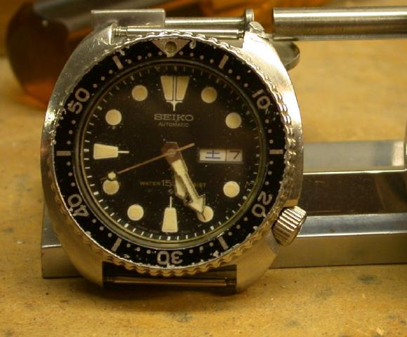 Take a look at the upper right hand lug!,someone has welded on it and got it to stick(?). This watch was actually running(8^)). The serial number on this watch starts with 77,and the case number is 6306-7001,based on its looks,and the lighting bolt under the 150 on the dial,I`m going to guess that this watch is from 1977. My Minty 6309 case also has a ser.num. that starts with 77. But its cased in Hong Kong,so I`m going to assume its from 1987.(personal note: these dates dont jive with the production dates I`ve heard on this board,so they`er up for speculation)