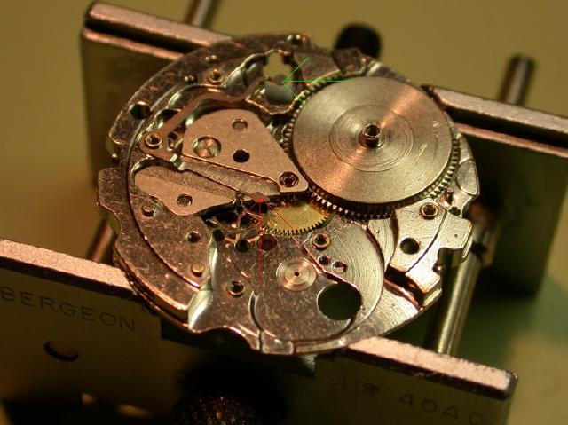 Ok,heres how it works:When the crown is pulled out,the set lever pushes the clutch in,which is keyed to the hack lever at the green arrow. The hack lever is forced to the center of the movement,piviting on the sholder at the far left. The extended arm(RED ARROW)then contacts the balance rim,causing it to stop,thereby HACKING the movement. YIPEE!!