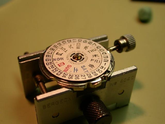 Heres what the top plate looks like with the calender dials installed. Many thanks to Dustin,for confirming that those are in fact Japanese characters on the day wheel.