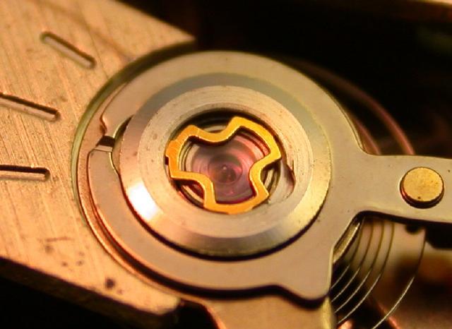 Remember the close ups of the balance cap jewels and my dissapointment with them? This is what a properly cleaned and oiled cap jewels looks like. Theres no film,or dirt. The oil is centered,and clean,you can see right though it.