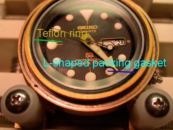 IN the photo above, we`re looking at the L-packing gasket. Not only does the coller nut force the crystal down into the gasket, but it also forces the side`s of the gasket down, causing the sides to expand sideways, making for an excelent seal.