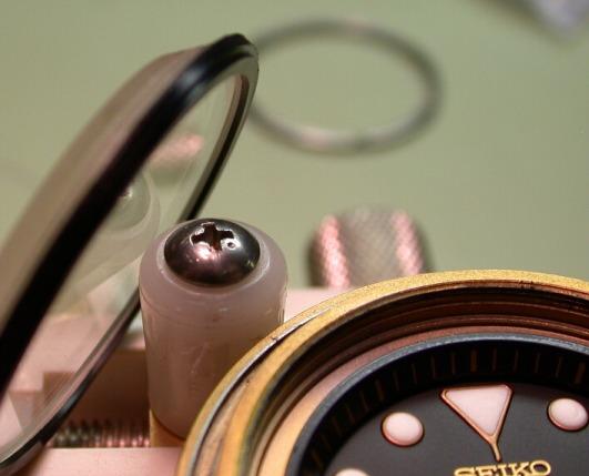 IN the photo above I`ve removed the coller nut, and the crystal is ready come out. The coller nut is designed so that a standard case back wrench fits into it. A NOTE TO THE WISE: I use a 50 dollar L&G wrench. When I was first starting out, I tried the 15 dollar imported wrench, and I must tell you that those are for amateurs and hacks, they can do more damage to your watch, and someone that really cares what they are doing would do well to steer clear of them.