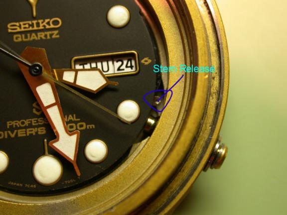 IN the photo above, I`v noted the stem release tab that extends out from under the dial. I found that the stem had to be in the nuetral, or simply unscrewed position for it to release, in the first and second positions of the crown, the stem release did nothing.