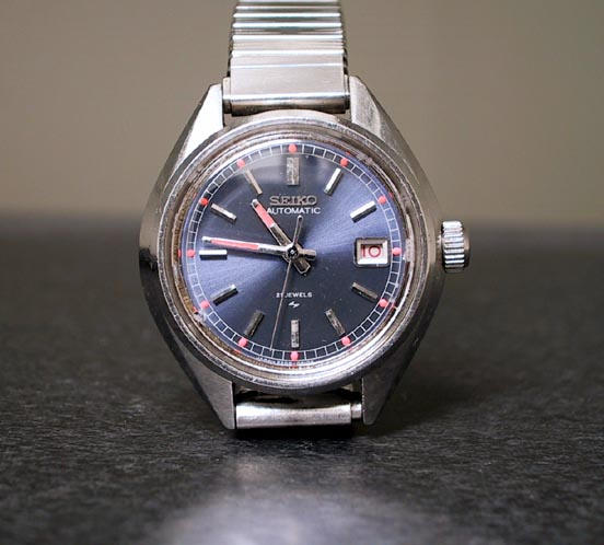 Here are two Ladies 2205 Seikos. The first, the purple one, is a tiny 27mm. I think the orange hands and markers are really neat, and they still have a bit of glow to them. The model # is 2205-0530, and is from 1973.