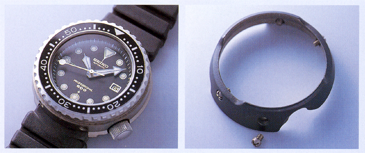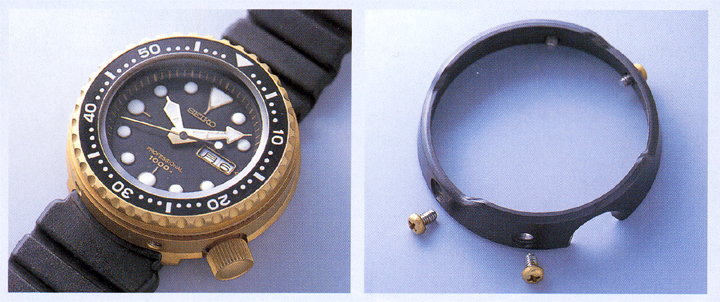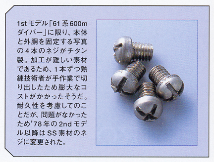 The 1st model (61 caliber automatic 600m Professional Diver's watch) which was released in 1975 had four screws which were made out of titanium to attach the protective outer cover to the watch case. Titanium was used for the screws because it was thought this would make the watch more shook proof, and for durability. However, these screws had to be made by hand, so it was extremely expensive. By 1978, when the 2nd model (75 caliber quartz 600m Professional Diver's watch), it was found that machine made stainless steel screws were just as effective as titanium ones and have been used from then on.