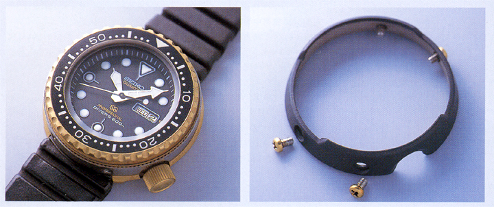 The 61 caliber automatic movement professional diver released in 1975, and the 75 caliber quartz model that was released three years later used a titanium protective outer cover, coated with high-tech ceramic finish. Since 1986, the 7C quartz caliber model 1000m model has used an all-ceramic outer cover which Seiko Corporation developed with ceramic manufacturer Kyocera.