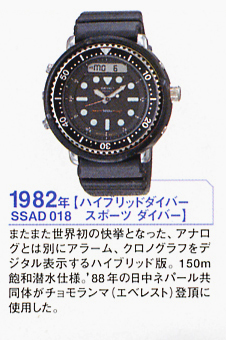 1982's Hybrid Diver 150m "Sports Diver." It was the first diver's watch in the world which featured a digital alarm chronograph display. This watch was used by a team comprised of members from Japan, China, and Nepal when they climbed Mt. Everest in 1988.