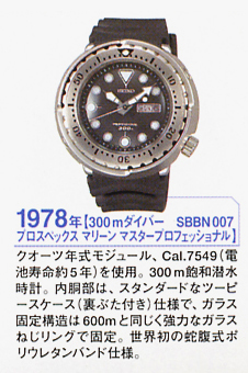 7549 caliber quartz 300m Professional Diver's watch, released in 1978. It had a standard two-piece case (main case and protective cover made of stainless steel), and an extra screw on retention ring to secure the crystal and prevent helium gas penetration. It was the first model released with a "wave-type" rubber strap.