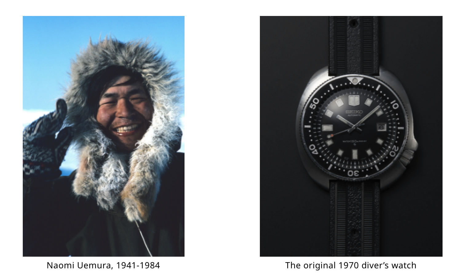 Japanese adventurer Naomi Uemura wore a 6105 diver in his 1974-1976 Arctic Expedition. Uemura embarked on "a 12,000-kilometer solo trek across the Arctic from Greenland to Alaska via the north coast of Canada, taxed his polar survival skills to the very limit. Uemura set off on the grueling journey in December 1974 and spent the next year and a half navigating the frozen, rugged expanse. His arrival in Alaska in May 1976 was a major triumph, his success against all odds solidifying his reputation as a world-class explorer" (Beyond the Limits: Remembering Legendary Japanese Adventurer Uemura Naomi).