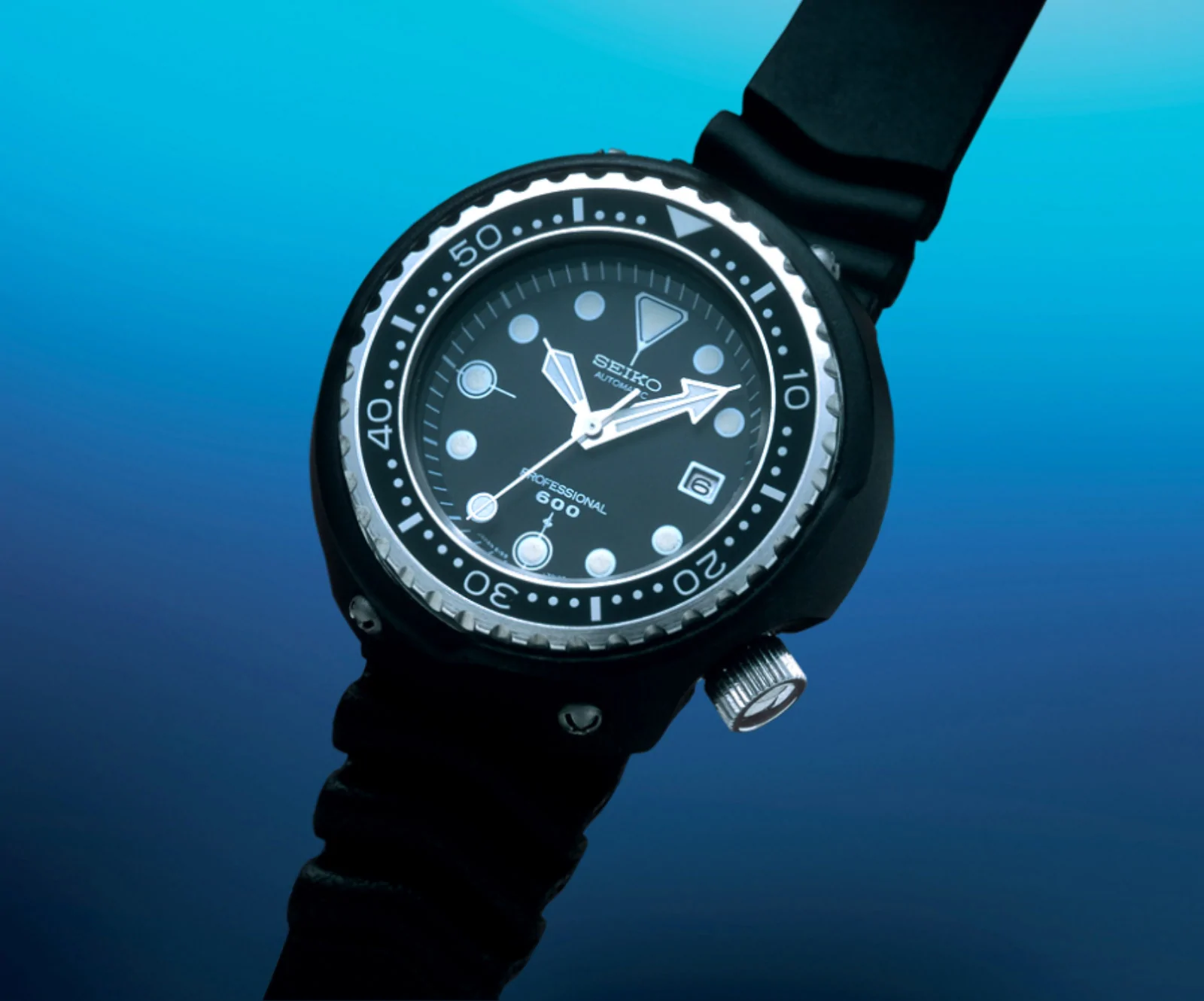 Seiko releases the 6159-022 (6159-7010) Professional 600m Diver, the world's first titanium watch designed specifically for saturation diving. It uses the 25J cal. 6159B movement beating at 36,000bph. This is the first of Seiko's iconic shrouded diver design inspired by the mechanical structure of a barnacle, thanks to the pioneering engineering work of Mr. Ikuo Tokunaga. The watch is known today as the original "Tuna" with a two-piece construction consisting of a heavy protective shroud over the watch case. The diver is also notable for a case design that is impermeable to helium gas, thereby eliminating the need for a helium value often used in other saturation diving watches. Seiko receives over 20 patents on this watch's design.